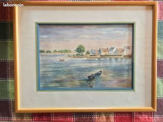 Cède une peinture dite aquarelle sur papier de Mme Madeleine MASSON, c'est une pièce unique signée de l'an 1989, cela représente une barque de pêcheurs sur l'eau, avec en fond des