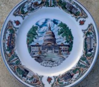 Cède une assiette décorative de 28 centimètres de diamètre en excellent état (neuve) représentant en son centre the Capitol à Washington et sur son pourtour 6 autres monuments de c
