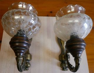 Appliques murales e verre laiton et bois hauteur totale 24 cm diamètre du verre 15 cm5 hauteur du verre 15 cm j'ai 2 appliques à 45 euros pièce