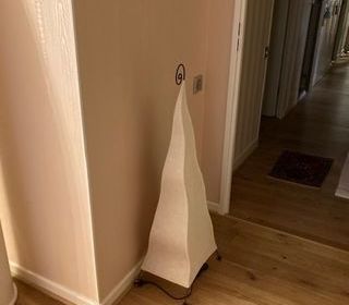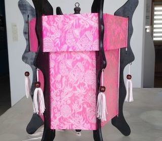 cède un lustre de style asiatique en bois de couleur noir et en tissu de soie rose et blanc. D'une hauteur de 40 centimètres pour une envergure (diamètre) de 34 centimètres.