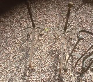 Vds ornements pour cheminée comprenant une plaque de fonte 50x70cm environ et un porte balai.pelle.pince.tisonier 2 chevalets pour bûches Le tout en bon état A venir chercher
