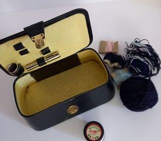 Ancienne petite boite à ouvrage ancienne, en cuir, pour la couture La boite est vendue avec quelques accessoires