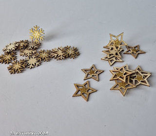 Lot de 24 pièces en bois pour la décoration de Noel , étoiles et flocons à paillettes Elles peuvent se mettre partout, sur la table, sur le sapin, sur les paqu