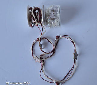 3 Rubans tressés accompagné de perles rouge, blanche, et nacre, avec des sapins et des étoiles Lot de 2 bobines de ruban tressé soit 4 mètres L