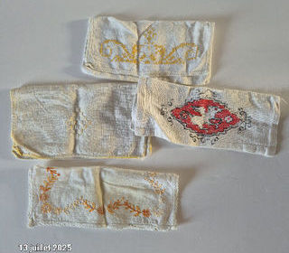 3 Porte Serviettes de table années 1960 brodé fait main coton FLEURS et FEUILLES, carré, ... 2 font 10 x 25 cm, et le dernier 24 x 13 cm