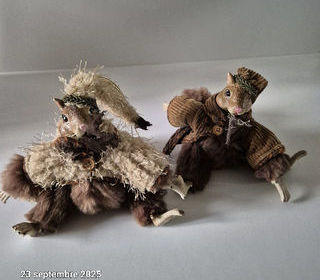 Petits écureuils habillés en brun velours, poil doux, soyeux, et chic, Les jambes sont mobiles Ces petites bêtes sont fabriquées avec soin, comme une oeuvre