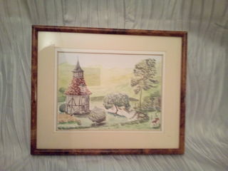 Peinture aquarelle paysage normand signé G.F. le cadre vintage est en bois demi-rond marron laqué moucheté Peinture : 17 x 22.5 cm Cadre : 25 x 31 cm en bois L'encadrement