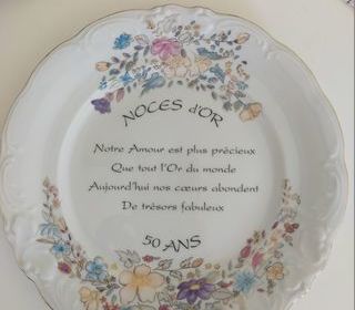 Assiette porcelaine déco "noces d'or 50 ans" sous motif floral Fabrique : ateliers de la cigogne à colmar en alsace en France Avec le texte "notre amour est plus précieux que