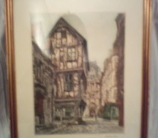 Superbe gravure ancienne de la Rue Saint Romain à Rouen, Normandie. Signé Leandu Cadre 33.5 x 26.5 cm Le cadre est doré et en bon état avec quelques éclats sur le bois (cadr