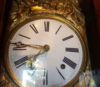 Très belle Ancienne Horloge Comtoise, en l'état (besoin d'être remise en état) Le coffre atypique d'une couleur marron/bordeaux est orné de dessins de fleurs, d'épis de blé et d'o