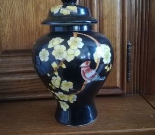 Bonjour, vend pot de couleur noir avec dessin d'oiseaux et fleurs Hauteur : 26 cm Diamètre : 16 cm En parfait état