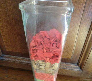 Vase en verre carré sable blanc au fond graviers verts graviers rouges morceaux de bois marrons morceaux de bois rouges Hauteur 32 cm A prendre près de Boos. Pas d'envoi
