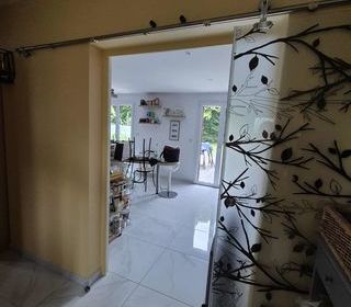 Porte coulissante verre décor végétal (2005x725) et système attache Manhattan pour 2 portes (1985x1610). Les roues d'une deuxième porte sont disponibles. Le système peut convenir p