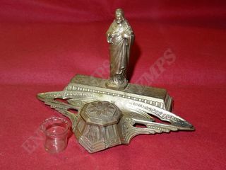 ANCIEN ENCRIER RÉGULE RELIGIEUX - Beau petit encrier ancien en régule avec son petit encrier en verre très fin. - Marqué France au dos et Made in France en dessous. - Mesure e
