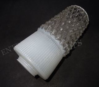 ANCIEN ABAT-JOUR EN VERRE CONIQUE OPAQUE & CLAIR #1 Ancienne tulipe en verre moulé bi colore opaque & transparent. Bon état. Forme générale conique, décors géométriques en r