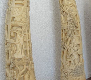 2 CORNES asiatiques sculptées en ivoirine (matière synthétiques imitant l'ivoire) n parfait état dimensions 47 x 10