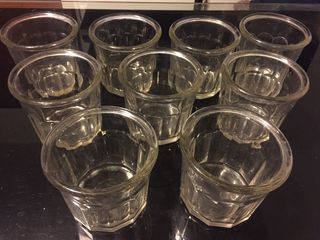 9 superbes pots à confiture à facettes en verre très épais.. Hauteur : 9 cm Contenance : 400 ml environ.