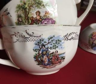 Lot de vaisselle vintage comprenant: 5 tasses à café 2 tasses à chocolat 7 soucoupes tasses à café. Medaillon couleur présentant des couples. Bordure dorée. En céramique.