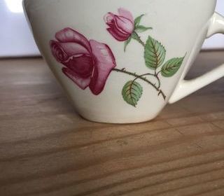 4 tasses à café Sarreguemines.Base carrée, motif rose.Parfait état