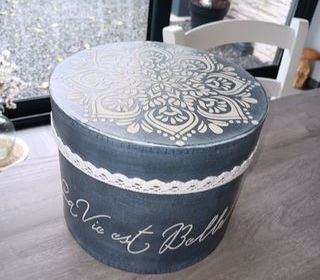 Boîte à chapeaux relookè , pochoirs en relief. Dimensions :21 en largeur et 18 en hauteur. Idéal pour une déco shabby.