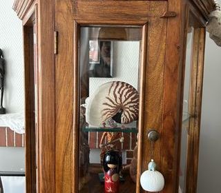 Vitrine bois exotique, hexagonale, 1,48m, 60cm d'empâtement, 1 étage et 2 étagères en verre épais. Beaucoup de classe, excellent état.