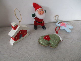 Décorations pour suspendre au sapin de Noël : petit papa de Noël, petite maison en bois, moufle et nounours en tissus