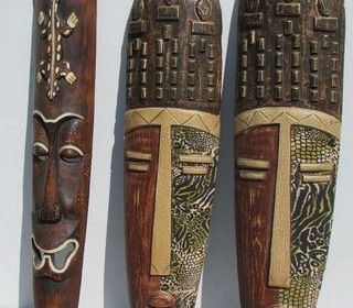 Décor Mural - Art Ethnique Artisanal - Masque en bois sculpté dans la masse vernis, et partiellement recouvert de tissu Décor de salamandre au relief mis en évidence par des t