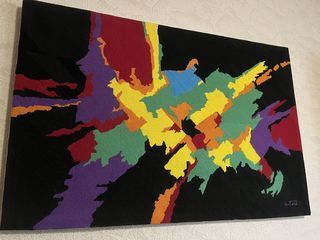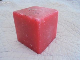 Bougie rouge de forme cubique. Probablement en paraffine. Un peu abîmée, mais jamais allumée. Dimensions : 7,5*7,5*7,5 cm