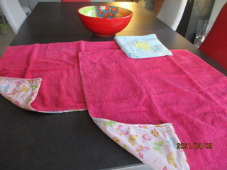 Deux sortie de bain pour bébé en éponge épaisse doublée de tissus, plus une serviette de toilette vert pale avec un incrustation d'un citron : -une sortie dimensions 60/70cm -une