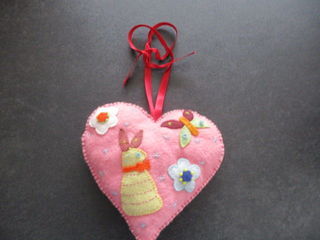 Coeur en feutrine rose, bien décoré, avec un noeud bordeaux, largeur 15cm hauteur 13cm, pour suspendre en décoration dans une chambre de bébé.