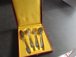 Couvert à ?uvres très anciens, en argent, dans un écrin, avec des initiales RA, neuf