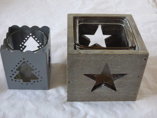 Vends deux photophores neufs, jamais utilisés, de couleur grise Le plus grand en bois, déco étoiles avec le pot en verre carré adapté pour la bougie : 4 € Le plus petit en métal,