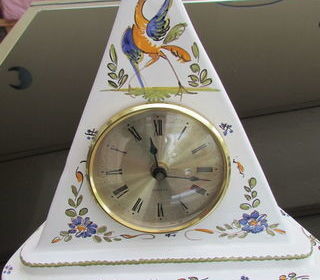 Superbe et rare horloge à poser en faïence, modèle Moustiers, typique par son oiseau fabuleux. Pendule à quartz, à pile, à vérifier. Signée. Dimensions: Hauteur: 25.5 cm, largeur: