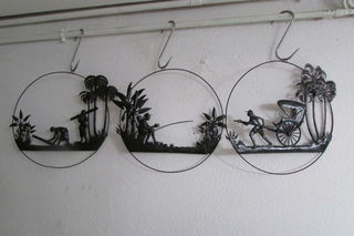 Originaires de Madagascar dans les années 70-80 , ces décorations murales en fer ciselé, représentent des scènes de vie , chacune dans un cercle, soit regroupé par quatre ou indivi