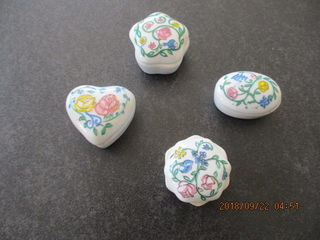 Quatre petites boites de décoration, avec couvercle, dimensions 3cm de large, 2cm de hauteur, au dos portant une étiquette FC, en faïence, en trés bon état
