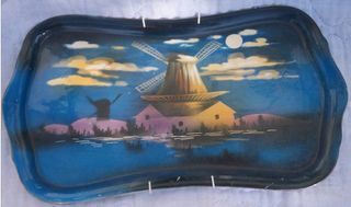 n plat décoratif à décor de moulin, prêt à être accroché (grâce à une accroche assiette au dos). Dimensions : 40 x 22 cm. Je n´en connais pas l´origine car il n´y a aucune