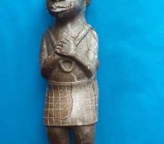 STATUE AFRICAINE en PIERRE Hauteur 27 cm Elle pèse pratiquement 2 kilos Ce personnage porte un mouton dans son dos Il manque un bout au pied, et sur le côté du pied. Néanmo