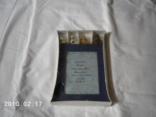 Un cadre photo décoré avec des chiens, encore emballé Dimensions : Le cadre : 14 cm x 17 cm (largeur x hauteur, les 17 cm incluant la hauteur des chiens). La ph