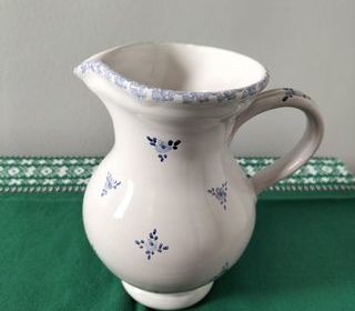 Je vends ce joli pichet, décoratif et utilitaire, fait et décoré à la main à Vallauris, à motifs fleuris bleus façon Moustiers. Ses dimensions : Hauteur = 17 cm Diamètre de la b