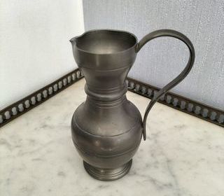 Je vends ce joli pot, avec anse, en étain ciselé. Ses dimensions : - hauteur = 13 cm, - largeur totale = 10 cm, - diamètre du col et de la base = 5 cm. Il est en bon état.