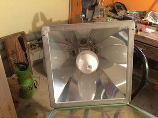Vends suspension industrielle dimension à la base 40x40 hauteur 40 montée avec l'ampoule de 800w déflecteur impeccable je peux expédier prix à l'uni