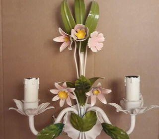Applique murale en métal double éclairage Vintage avec ses fleurs aux nuances de rose, ses feuilles aux dégradés de vert et ses bougies recevant deux ampoules (ampoules 40 watt ma