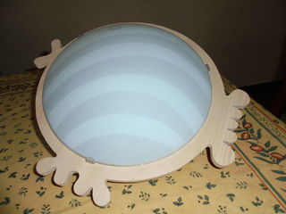 Vends 2 appliques murale, diamètre 30 cm. Première applique, contour en bois naturel avec globe en verre blanc opaque rayé de gris, représente un poisson, prix: 10 euros. D