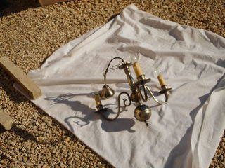 Lustre antique rustique de 3 ampoules en métal argenté, en très bon état.. Crochet à l'intérieur de la coupole pour attachement au plafond. Ampoules en forme de poires : 40 W max
