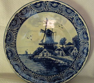 Très belle assiette décorative d'un moulin à vent dans la campagne Hollandaise peinte à la main dans les tons de bleus foncés. Marque DELF. Diamètre 26 cm. Poids 732 gr. Article