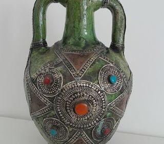 Très beau vase oriental ethnique artisanal en terre cuite verte, orné de métal ciselé et de pierres décoratives. Idéal pour décorer sa terrasse ou son jardin. Remise en main propre