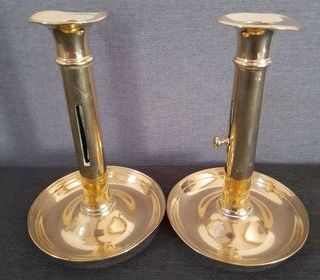 Paire de bougeoirs à poussoir en laiton massif (un poussoir manquant). Dimensions : H : 20 cm / diamètre base : 13 cm. Prix : 15 € pièce / 20 € la paire
