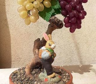 Ensemble "Figurine Lapin avec cep de vigne dans coupelle pleine" - ARTISANALE > matériaux pleins (Plâtre - Bois) > Les grappes de raisins sont des accessoires ajoutés par la suit