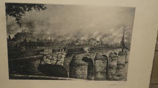 Gravure eau forte ( Pont de Blois ) Blois : guerre 1939-1945, bombardement du pont et de la ville. 41 X 32,5 cm ( gravure ) 29 X 19,5 cm papier vélin sous film jamais o