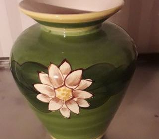 C'est une pièce décorée à la main pour ce qui est du décor floral. Le fond vert et les deux liserés jaunes ont été réalisés à la tournette. Hauteur 20 cm. Largeur maxi 16 cm.